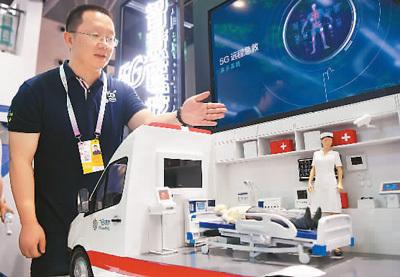 工作人員在智博會上介紹“5G智慧醫(yī)療”中的“5G遠程急救”技術(shù)。新華社記者 唐 奕攝